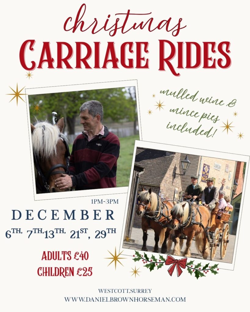 This December, join us for a festive carriage ride through the beautiful village of Westcott. Begin your adventure at our Surrey Hills farm, where you’ll be treated to stunning views, mulled wine and mince pies, before embarking on a scenic horse and carriage journey around the village.
